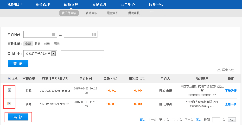 2)在要审核的记录左侧勾选/全选 ,并点审核按钮,可以对多条记录进行一次性审核。