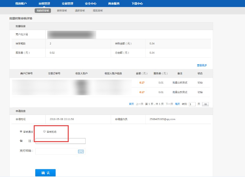 b. 选择审核拒绝, 填写备注,点击“确认”按钮。